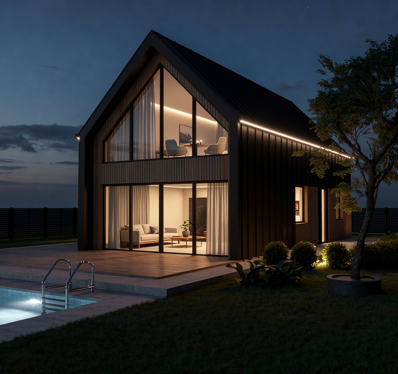 Prosta, minimalistyczna bryła nawiązuje do aktualnych trendów, ale zachowuje ponadczasowy charakter. Duże przeszklenia otwierają wnętrze na otaczający krajobraz, potęgując poczucie przestrzeni i zanurzenia w naturze. Architektura pracuje tu światłem, widokiem i proporcją, tworząc wrażenie spokoju i luksusu bez nadmiaru środków.