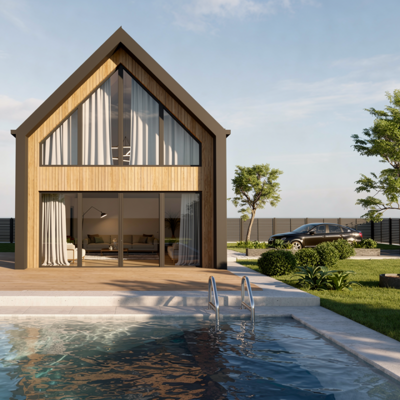 Integralną częścią projektu jest strefa zewnętrzna – taras wypoczynkowy oraz basen, które znacząco podnoszą atrakcyjność obiektu i komfort użytkowania. Przewidziano również wygodny dojazd i możliwość parkowania samochodem bezpośrednio przy budynku, co jest istotne z punktu widzenia funkcji najmu.
