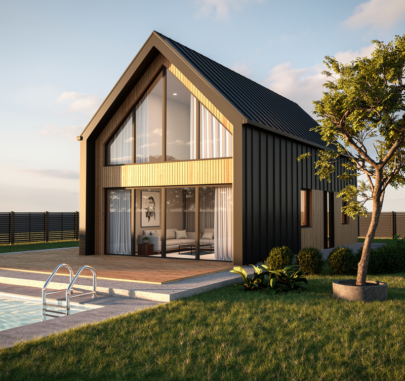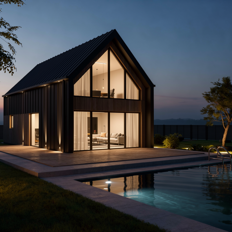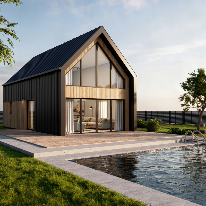 Dom zaprojektowano z myślą o realizacji w technologii prefabrykowanej, co pozwala na skrócenie czasu budowy, kontrolę jakości oraz optymalizację kosztów. To projekt elastyczny, powtarzalny i skalowalny – nowoczesna stodoła jako produkt inwestycyjny, który łączy modną formę, funkcjonalność i silną relację z naturą.