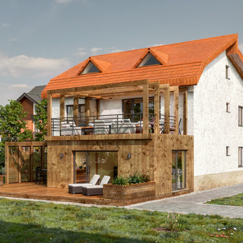 Projekt rozbudowy domu zakładał zachowanie istniejącej bryły w niezmienionej formie. Celem było dobudowanie nowej strefy funkcjonalnej, która jednocześnie tworzyłaby taras na wyższej kondygnacji, bez naruszania charakteru pierwotnego, bardziej tradycyjnego budynku.