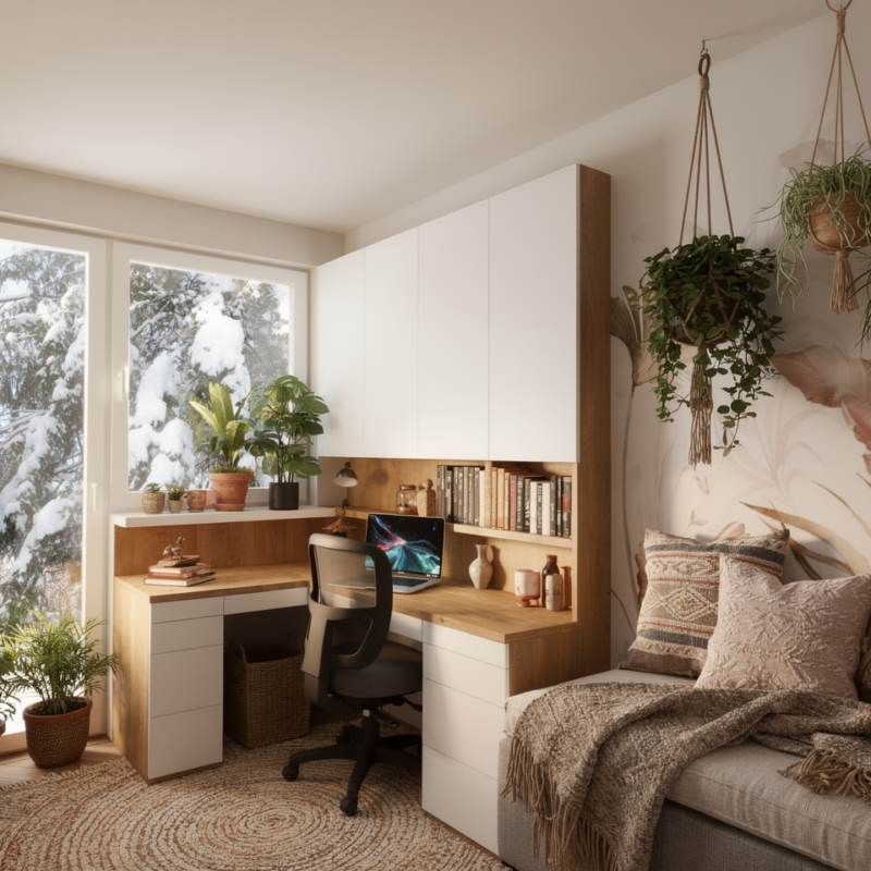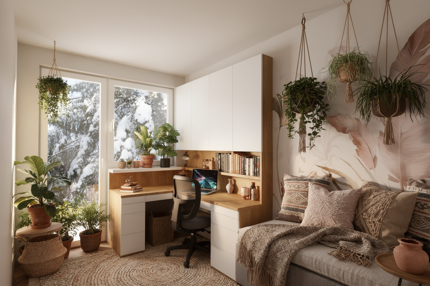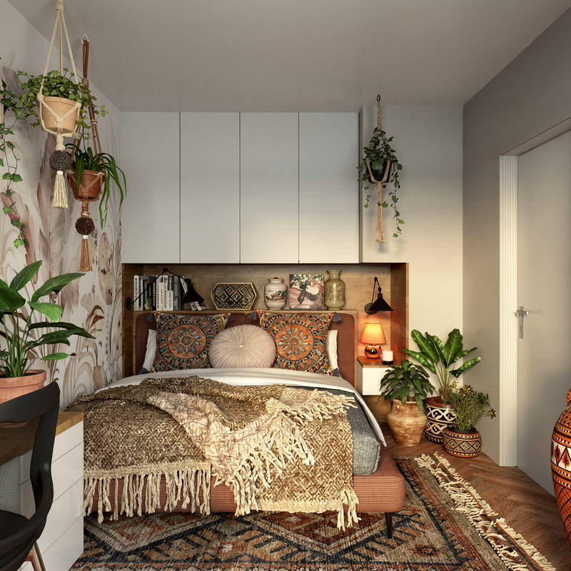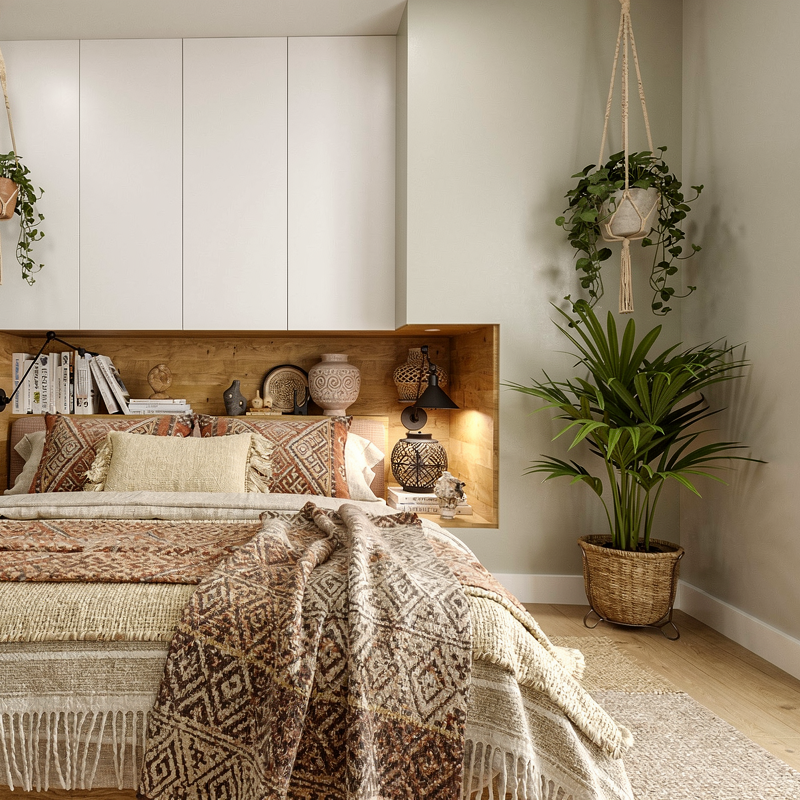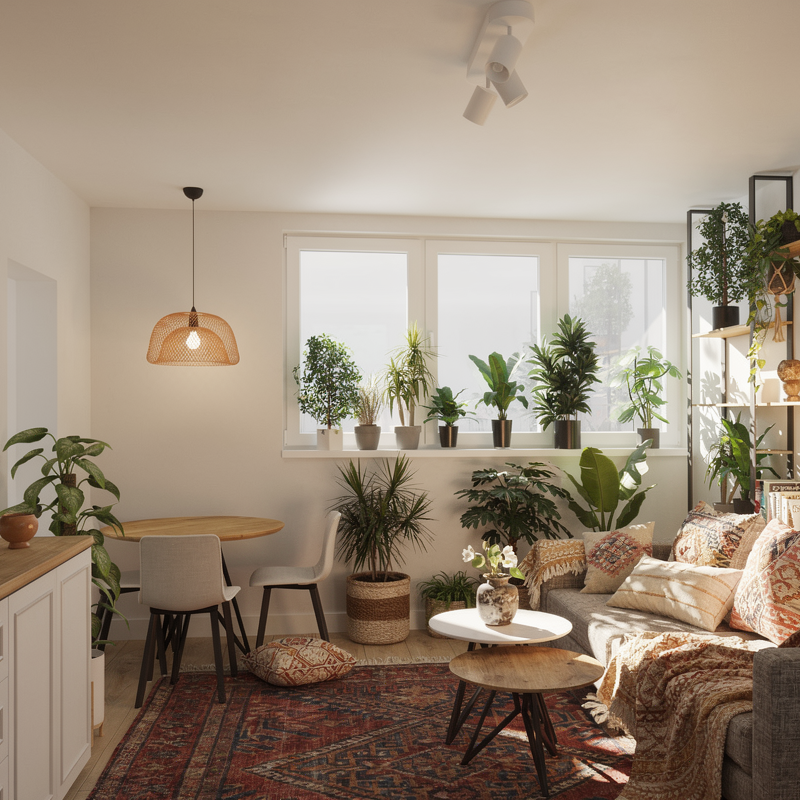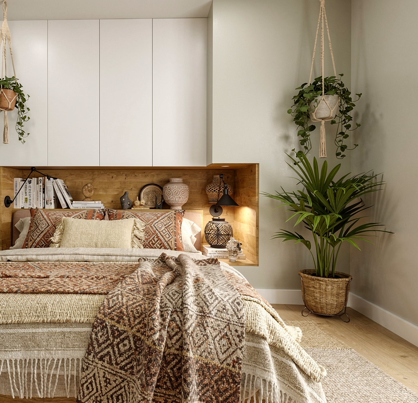 Styl boho stał się punktem wyjścia, jednak został świadomie dopasowany do charakteru mieszkańców. Ciepłe barwy, naturalne materiały i miękkie światło budują przytulną atmosferę, a elementy przeniesione z poprzedniego mieszkania nadają przestrzeni osobisty, oswojony charakter.