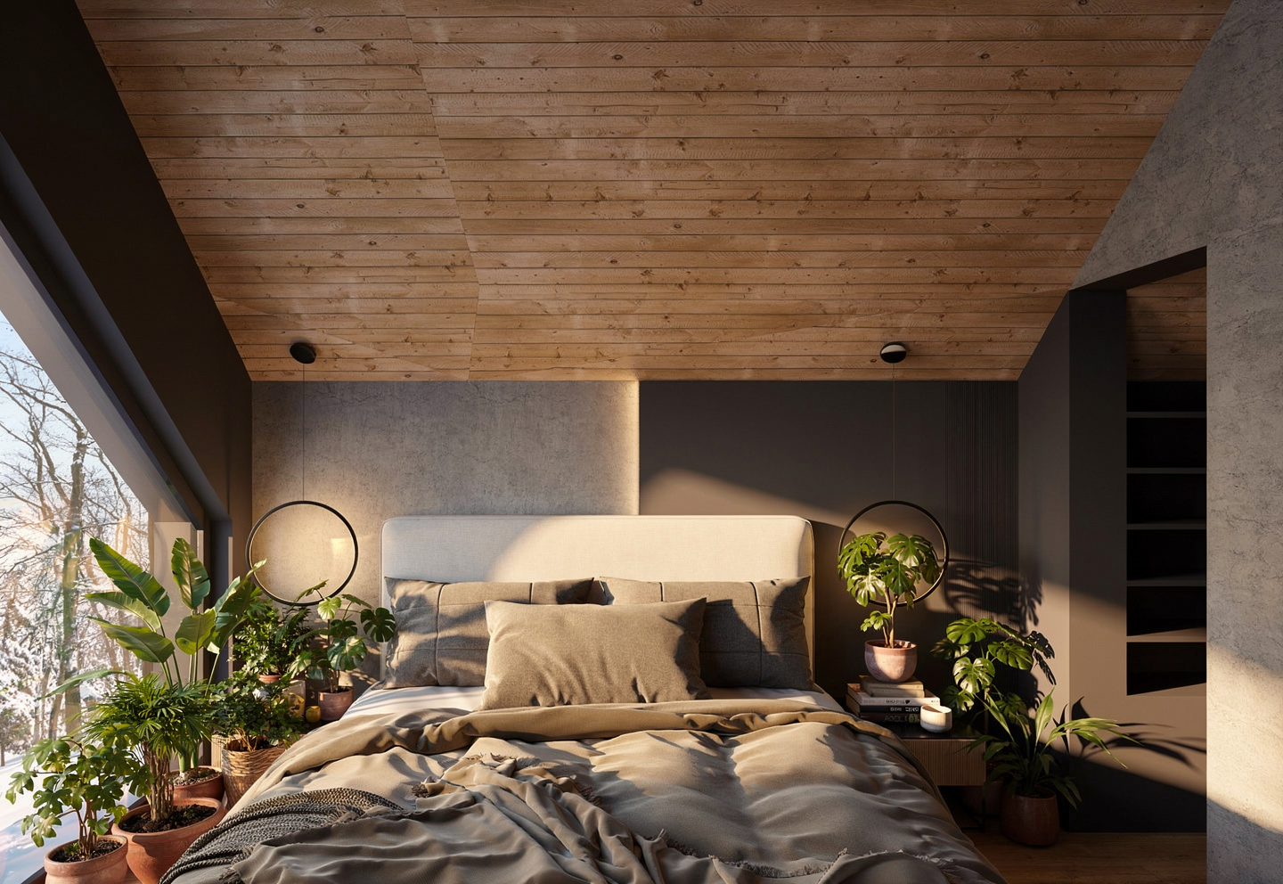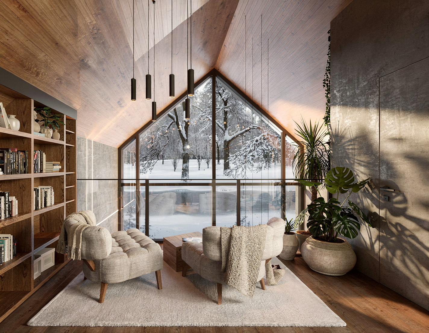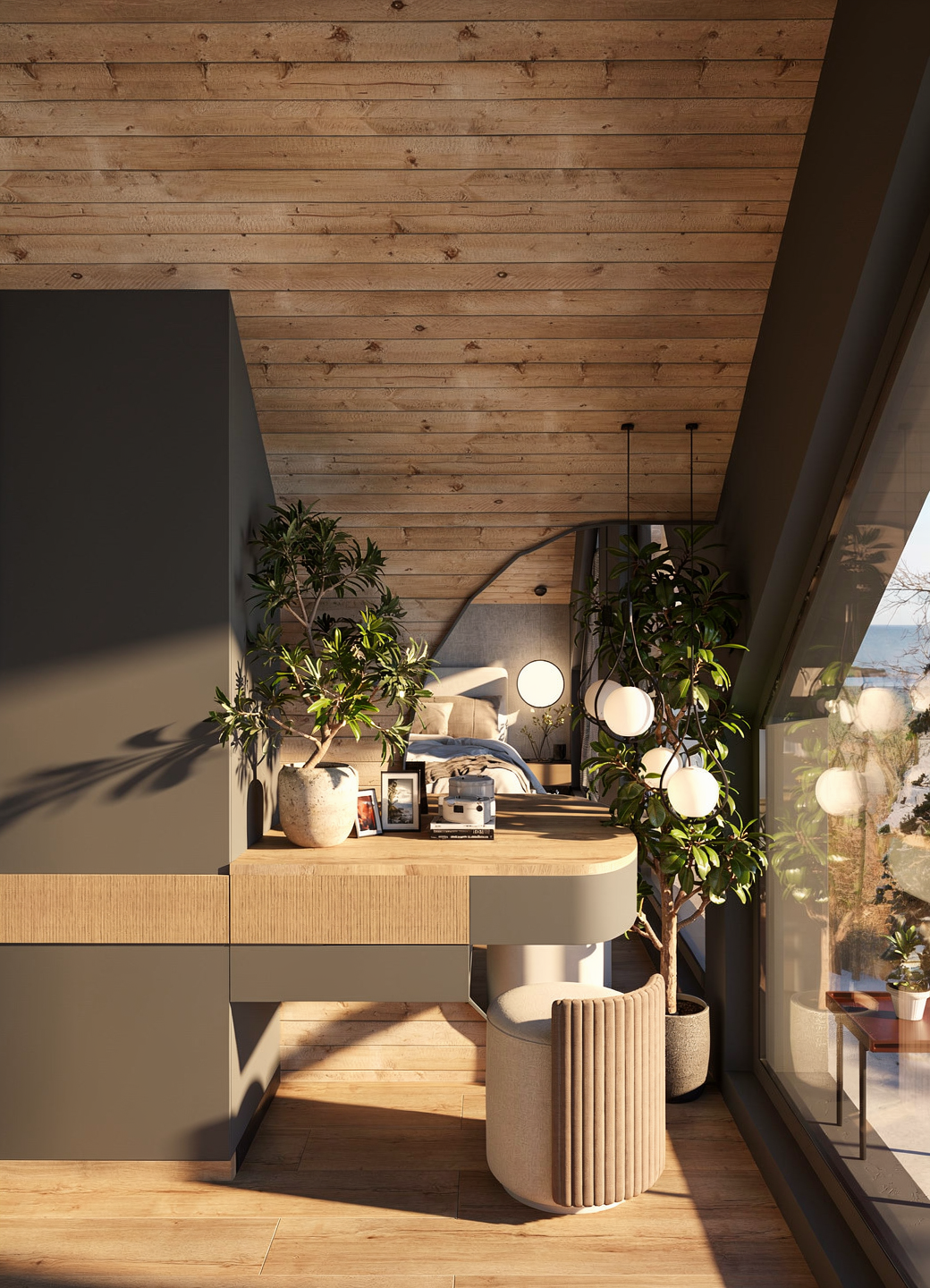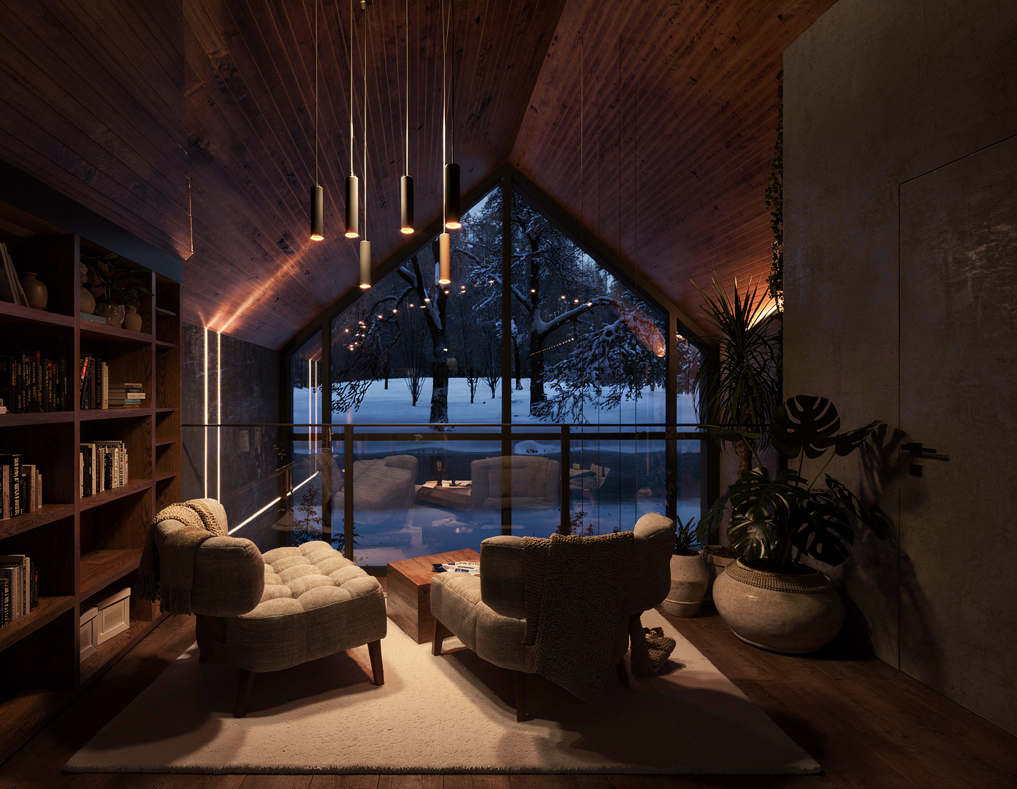 Antresola pełni funkcję miejsca obserwacji i odpoczynku, z widokiem zarówno na wnętrze domu, jak i na otaczającą naturę. Całość dopełniają miękkie faktury i starannie zaprojektowane światło, dzięki czemu nowoczesna stodoła staje się domem ciepłym, spokojnym i przyjaznym – zaprojektowanym z myślą o długim, codziennym użytkowaniu.