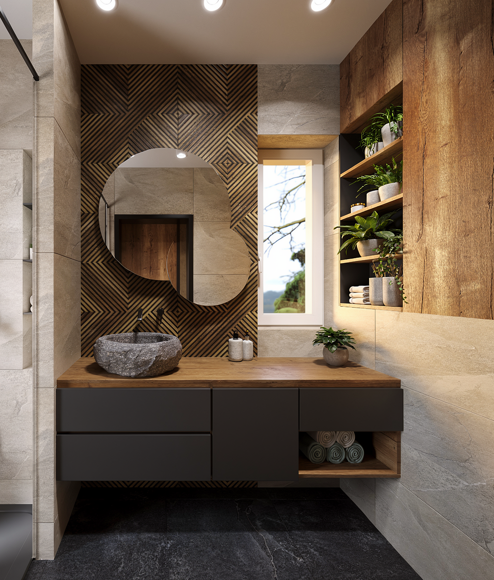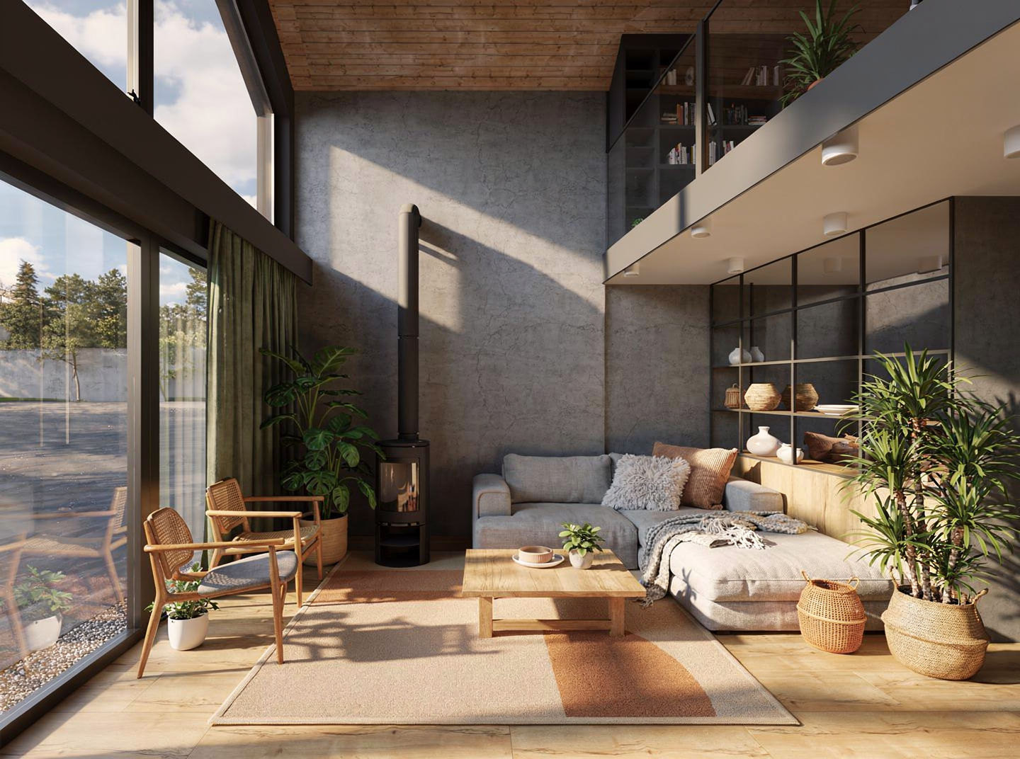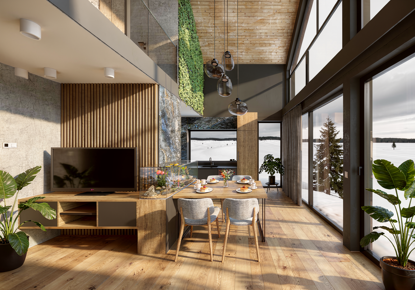 Styl wnętrza jest nowoczesny, ale przytulny i ponadczasowy. Naturalne materiały, spokojna paleta barw i proste formy tworzą tło dla codziennego życia, nie konkurując z widokiem za oknem. Przestrzeń dzienna została zaprojektowana tak, by sprzyjać wyciszeniu, ale też wspólnemu spędzaniu czasu.